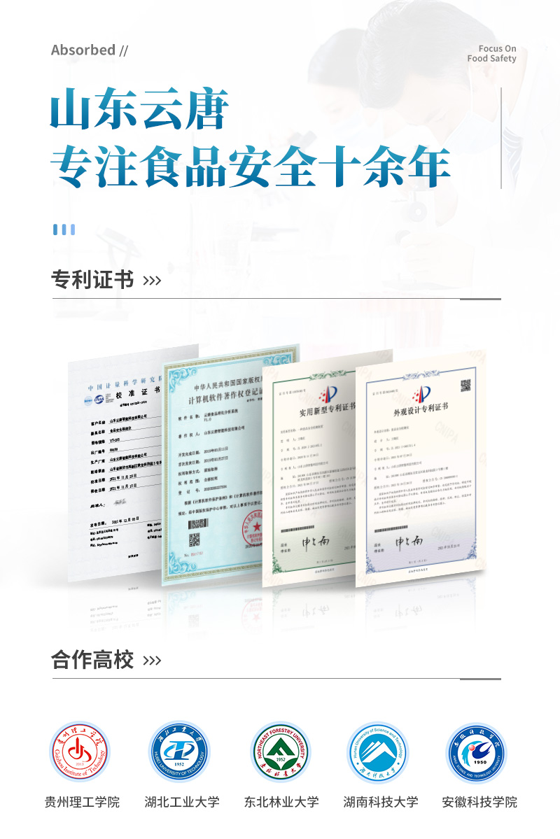 山東云唐智能科技有限公司生產(chǎn)的果蔬肉類(lèi)檢測(cè)儀,采用手提箱式一體化設(shè)計(jì),可快速檢測(cè)幾十種項(xiàng)目,包含各種蔬菜水果中有機(jī)磷和氨基甲酸酯類(lèi)農(nóng)藥殘留,病害肉診斷:肉中組胺、揮發(fā)性鹽基氮;各種肉食品中瘦肉精激素類(lèi)殘留、抗生素、獸藥殘留等現(xiàn)場(chǎng)的定性定量檢測(cè)。